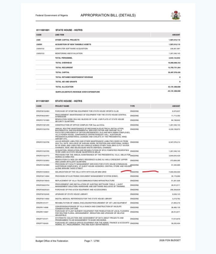The President Bola Tinubu-led administration has budgeted another N7billion for the solarisation of the Presidential Villa in 2026.