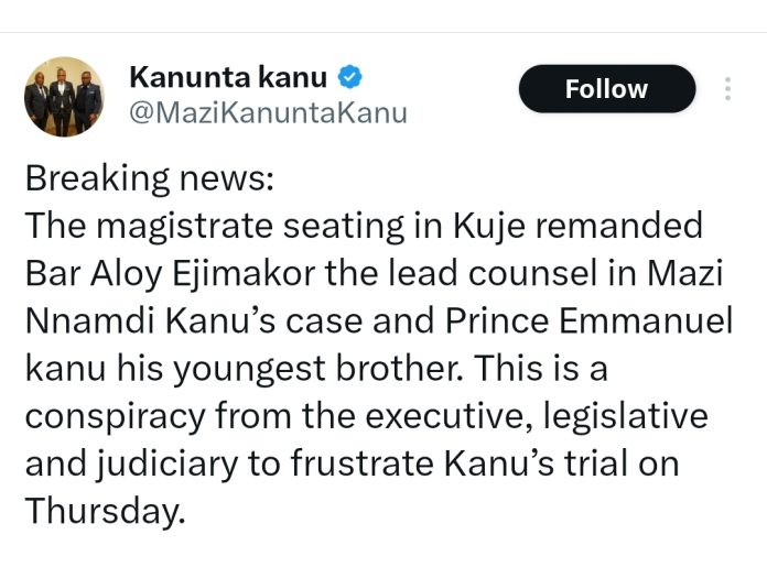 “The magistrate seating in Kuje remanded Barrister Aloy Ejimakor the lead counsel in Mazi Nnamdi Kanu’s case and Prince Emmanuel kanu his youngest brother. This is a conspiracy from the executive, legislative and judiciary to frustrate Kanu’s trial on Thursday,” Kanuta Kanu posted on X.