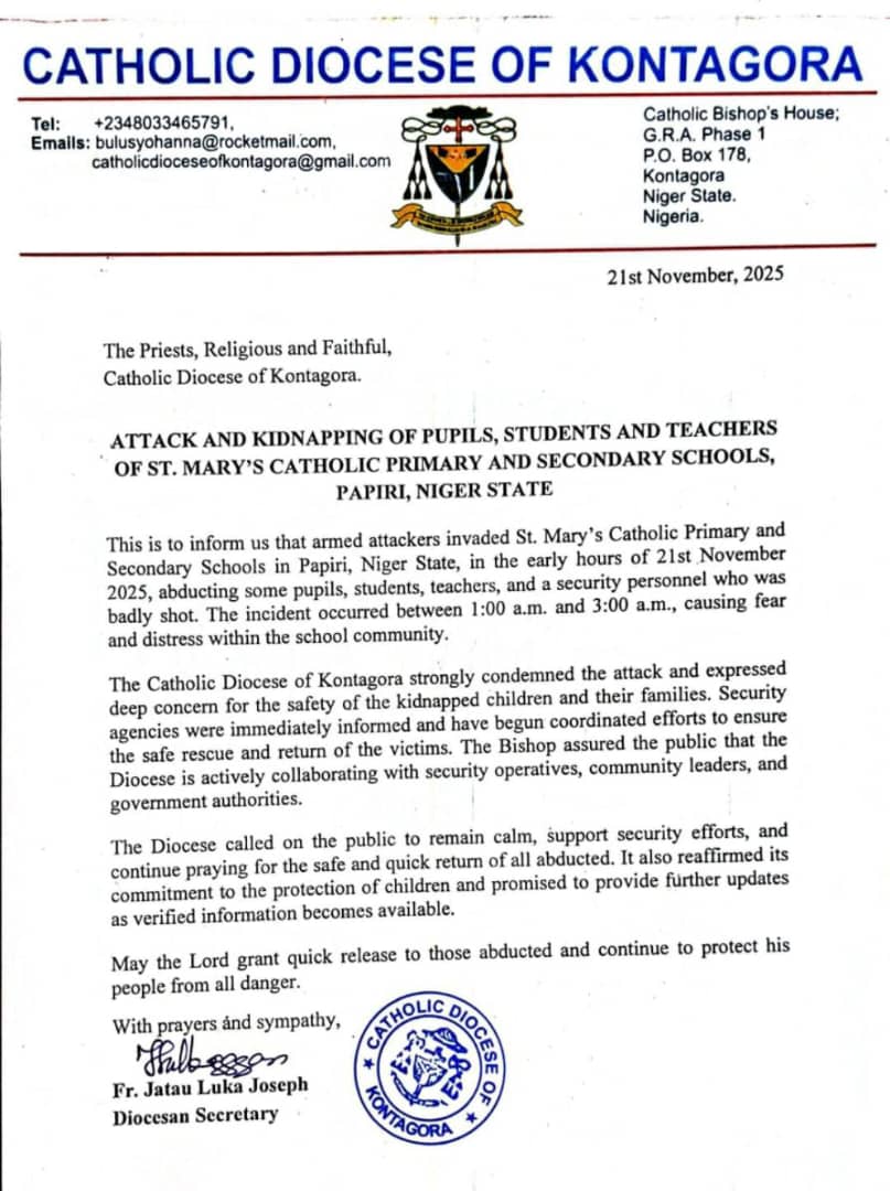 Over a 100 School Children kidnapped last night at Saint Mary’s primary and secondary school papiri Kontongora local government area of Niger State.