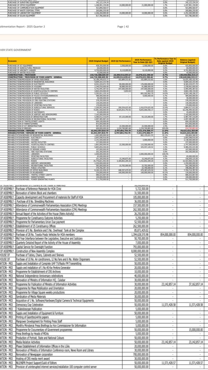 A review by SaharaReporters of the Cross River State budget performance document for the first half of 2025 shows that N8 billion was allocated for the construction of a new Assembly complex.