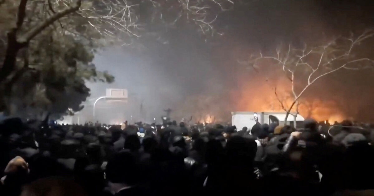 In footage from the northeastern city of Mashhad, smoke can be seen billowing into the night sky from fires in the street, masked protesters, and a road strewn with debris, another video posted on Saturday showed. Explosions could be heard.