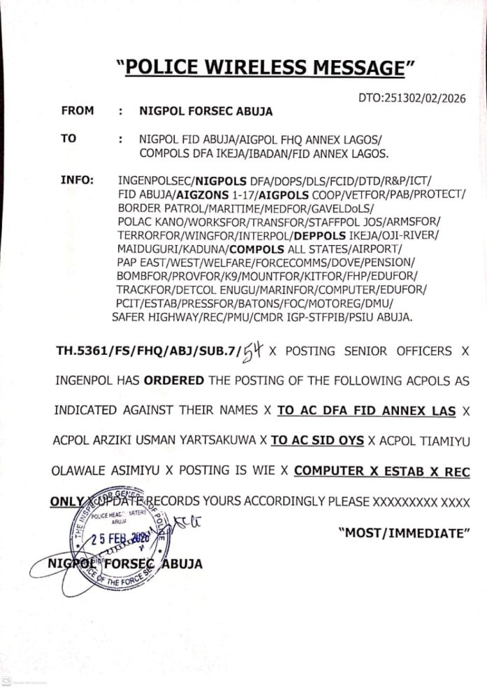 One such signal, dated February 23, 2026, ordered the mobilisation of ASP Bakare Saheed from the IGP Secretariat in Abuja to Mobile Police Squadron 20 in Lagos. The message instructed authorities to “warn and release the officer to proceed accordingly” and update official records.