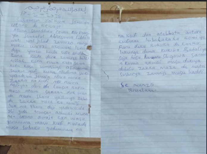 According to residents, the threat was conveyed in a handwritten letter addressed to the district head of Utono, written in Hausa language and dated February 17, 2026.
