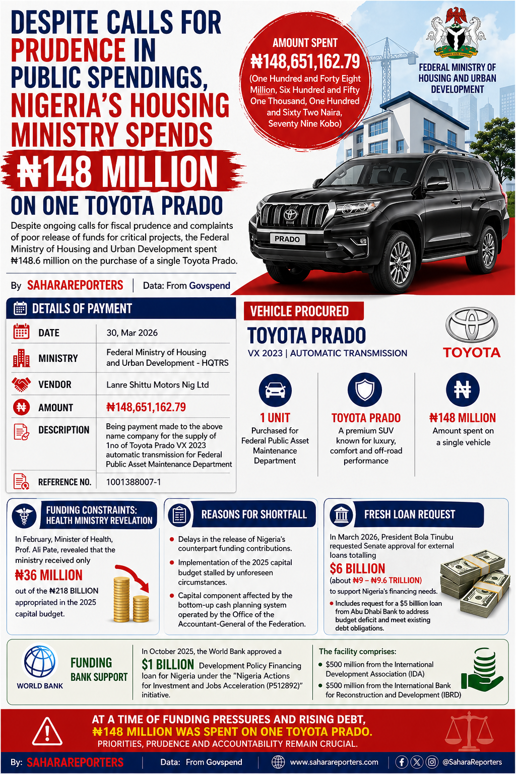 Fresh scrutiny has emerged over public spending in Nigeria following records showing that the Federal Ministry of Housing and Urban Development expended ₦148.6million on the procurement of a single Toyota Prado SUV, despite ongoing concerns about funding constraints affecting key government projects.