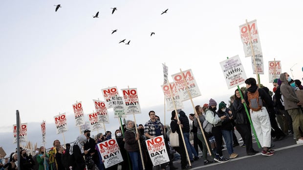 Despite the apparent stand-down, a handful of U.S. Border Patrol vehicles arrived at a U.S. Coast Guard base in the Bay Area on Thursday morning and were met with several hundred protesters.