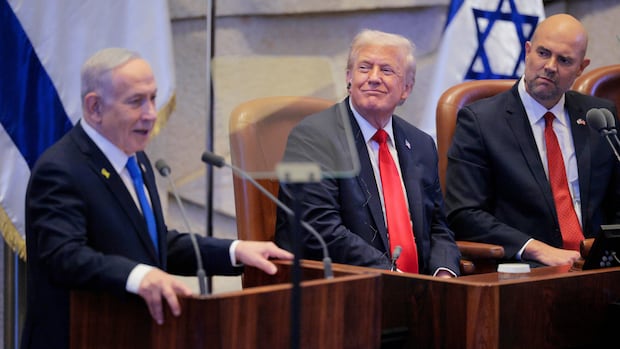 Netanyahu spent a large portion of his address praising Trump, even saying he should be awarded Israel’s top prize as he didn’t get the Nobel Peace Prize.