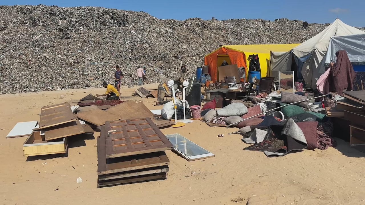 In Al-Zawaida, in the central Gaza Strip, some families driven out of their homes by the Israel-Hamas war have set up shelter in a landfill. ‘I try to protect my kids. I don’t sleep so the dogs don’t come in on us,’ Omar Al-Far, 41, says. ‘There’s poison and the smell of dead animals.’